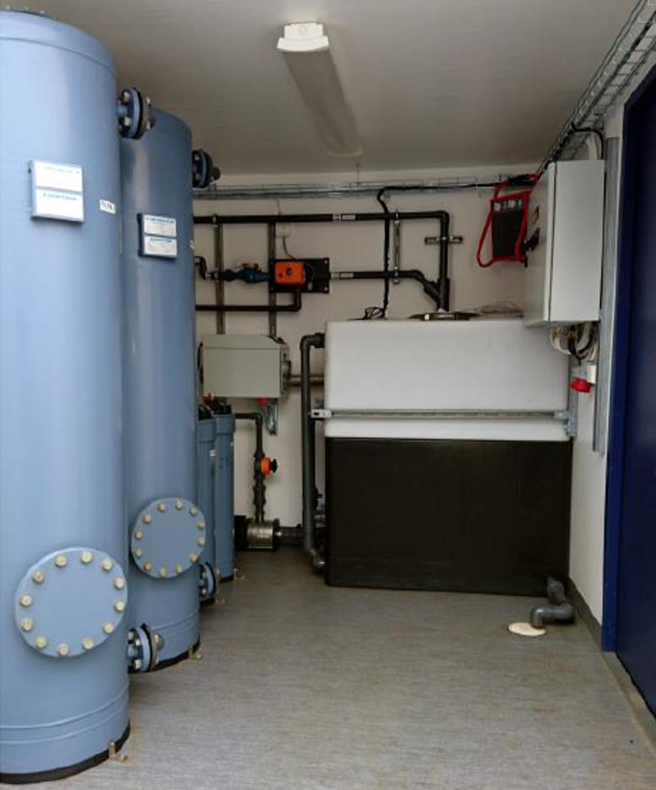 Kompakt 10-fots mobil filtercontainer som effektivt renar förorenat vatten. Anläggningen har en 650 liters bufferttank för råvatten, två påstryckfilter och två filterkolonner som kan fyllas med olika filtermedia, såsom aktivt kol, sand eller jonbytarmassa.