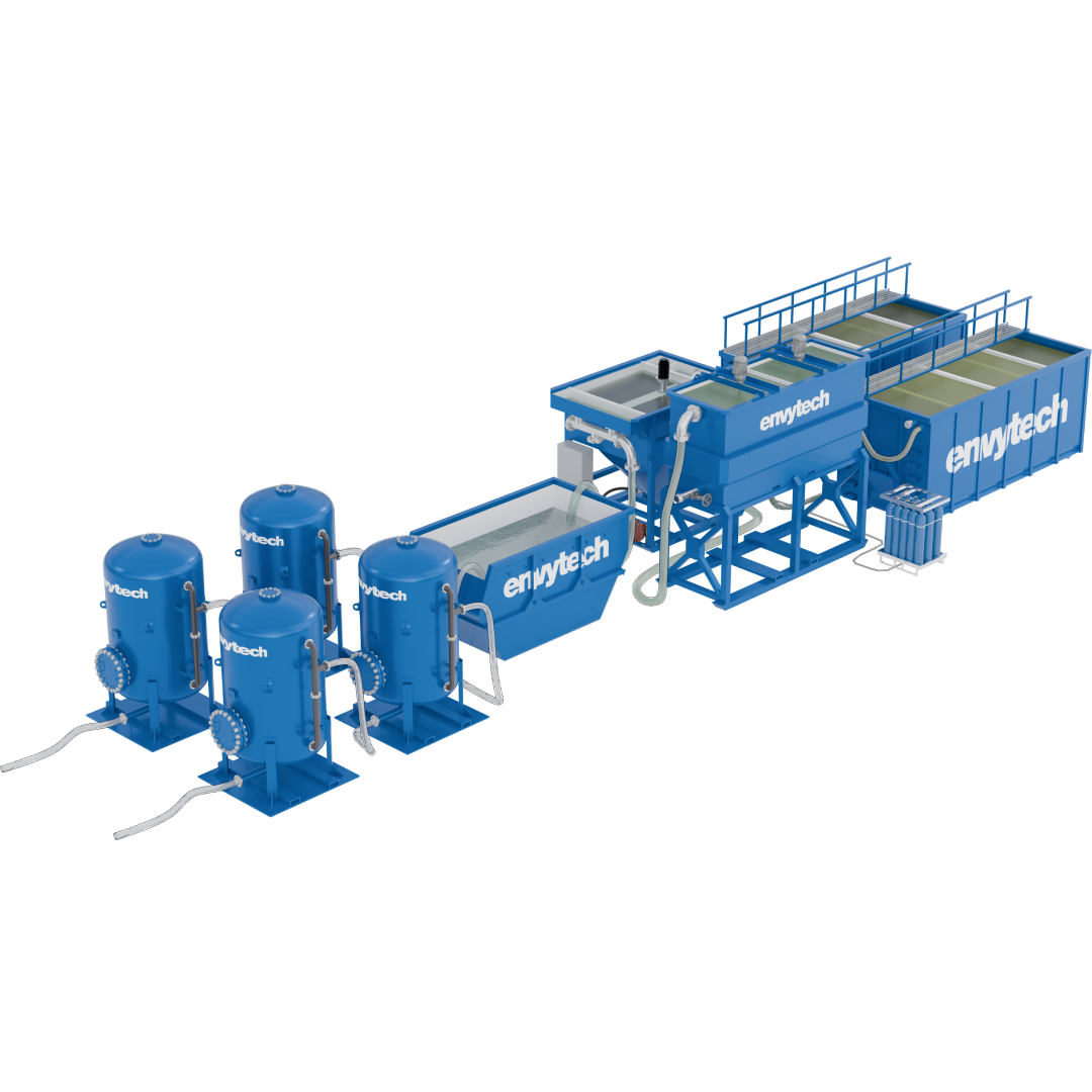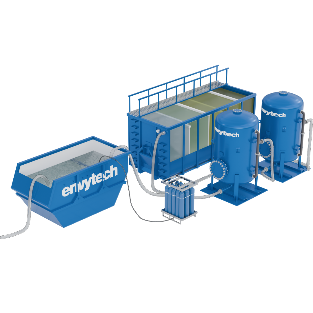 I denna lösning har tryckfilter adderats till sedimenteringssystemet. Efter att partiklar separerats i sedimenteringscontainern leds vattnet genom tryckfilter där föroreningar som exempelvis metaller avlägsnas. Filtermediat anpassas efter vattnets specifika föroreningar. Därefter går vattnet till lagringscontainern där pH-justering sker.